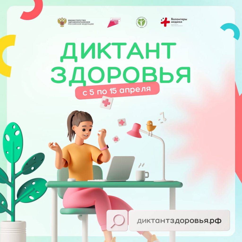 Обеспечение охвата всех граждан страны профилактическими медицинскими осмотрами и диспансеризацией — важная часть нацпроекта «Здравоохранение». Диктант здоровья позволит повысить знания населения в направлении профилактики и ранней диагностики заболеваний, а также узнать подробнее о факторах риска, которые вредят здоровью.Вопросы к диктанту здоровья были разработаны ВОД «Волонтеры-медики» и рецензированы сотрудниками ФГБУ «НМИЦ ТПМ» Минздрава России и Роспотребнадзора.Сайт для проведения диктанта был разработан к акции в 2022 году. В этом году принять участие в диктанте смогут и школьники, для них подготовили «Параграф о здоровье». Задания, направлены на повышении уровня информированности школьников о здоровье и ведении здорового образа жизни, ребята смогут проходить задания индивидуально. При выполнении всех заданий участникам высылаются электронные сертификаты.«Диктант пройдет с 5 по 15 апреля во всех регионах страны в рамках Всероссийской акции «Будь здоров!». В этом году волонтеры-медики расскажут о правилах здорового питания и способах укрепить ментальное здоровье, напомнят о важности спорта и регулярной диспансеризации. В 2022 году участниками диктанта стали свыше 25 000 человек. Уверены, что в этом году желающих проверить свои знания будет еще больше», — отмечает председатель Всероссийского общественного движения «Волонтеры-медики» Анастасия Зацепурина.«С началом пандемии коронавируса всему миру пришлось заново учиться правилам гигиены. Комплексный информационно-просветительский проект Роспотребнадзора «Санпросвет», реализуемый в рамках федерального проекта «Санитарный щит страны – безопасность для здоровья», направлен на распространение современных санитарно-гигиенических знаний и навыков, формирование новой санитарной культуры населения нашей страны. В фокусе внимания Роспотребнадзора все возрастные категории, но особое внимание Служба уделяет подрастающему поколению. Важно заложить основы санитарно-гигиенической грамотности с самых ранних лет, так как именно в детстве формируются самые устойчивые привычки и правила поведения. «Диктант здоровья» — это один из способов донести важные знания до молодежи», – отметили в Роспотребнадзоре. Организаторы: ВОД «Волонтеры-медики», ФГБУ «Национальный медицинский исследовательский центр терапии и профилактической медицины» Минздрава России, РОПНИЗ, АНО «Национальные приоритеты».Партнеры: Министерство здравоохранения Российской Федерации, Росмолодёжь, Проект Роспотребнадзора «Здоровое питание», Российское движение детей и молодежи «Движение первых», ГК «МедИнвестГрупп», ОАО «РЖД».Всероссийское общественное движение «Волонтеры-медики» является одной из крупнейших добровольческих организаций в сфере здравоохранения в Европе. При поддержке Минздрава России в стране открыты 89 региональных отделений Всероссийского общественного движения «Волонтеры-медики», объединяющих более 130 тысяч человек. Ежегодно помощь и поддержку волонтеров-медиков получают около 4 млн россиян.