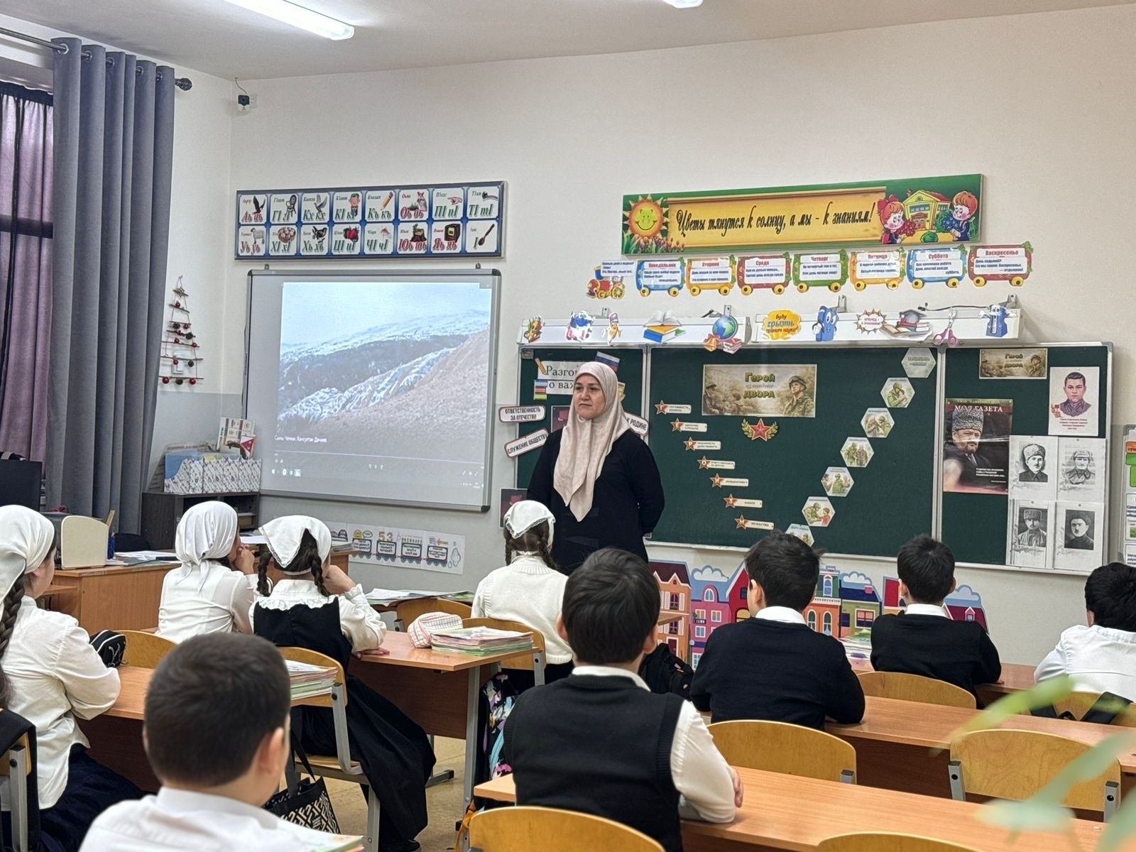 В МБОУ «СОШ №65» города Грозного прошли внеурочные занятия в рамках цикла «Разговоры о важном», посвящённые Дню защитника Отечества. Тема занятий — «Герои из соседнего двора»